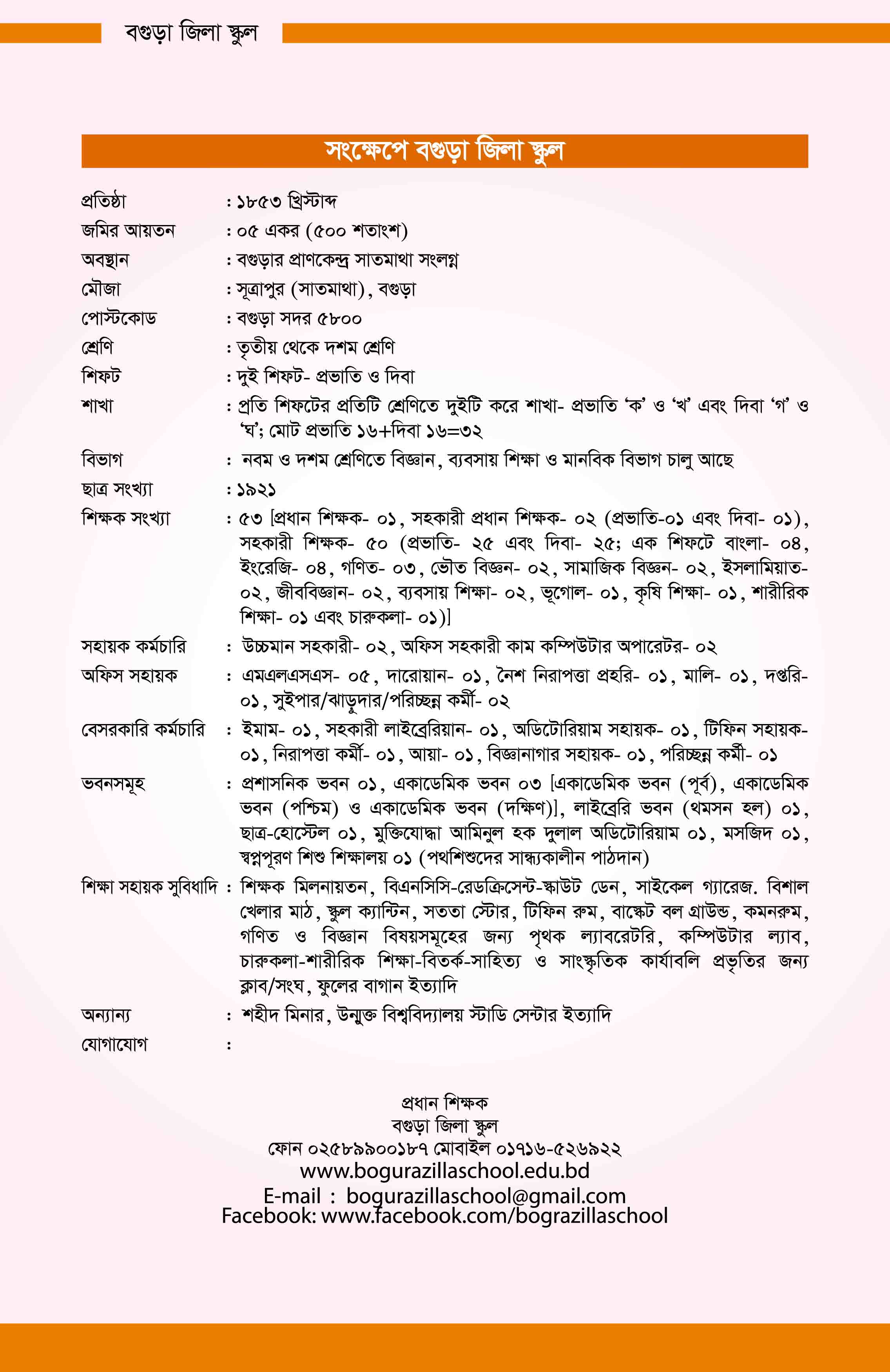 “কোন এক বিদ্যাপিঠের কথা তোমায় শোনাই শোন রূপকথা নয় সে নয়, জন্মের শুরু থেকে জ্ঞানীজনের হাতে গড়া ও তার শীর্ষে উঠারকাহিনী শোনাই শোন”।১৮৪৪ সালে ইংরেজ প্রশাসক লর্ড হার্ডিঞ্জ যখন ইংরেজি শিক্ষাকে গুরুত্ব সহকারে অগ্রাধিকার দেন তখন সেই ইংরেজি শিক্ষার জোয়ার স্পর্শ করে বরেন্দ্র ভূমিকে, স্পর্শ করল বগুড়াকেও। তাই ১৮৫৩ খ্রিস্টাব্দের পূর্বে বগুড়ায় জন সাধারণ কর্তৃক পরিচালিত একটি ইংরেজি বিদ্যালয় প্রতিষ্ঠিত হয়েছিল যা ছিল বর্তমান জিলা স্কুলের ভ্রুনমূল এই ভ্রুণমূল নামক এই বিদ্যালয়কে ঐ সালেই বিদ্যোৎসাহী ম্যাজিস্ট্রেট ও কালেক্টর মিঃ রাসেল সাহেবের ঐকান্তিক প্রচেষ্টায় তদানীন্তন ডেপুটি কালেক্টর বাবু সূর্য্য কুমার মুখোপাধ্যায় -এর অশেষ পরিশ্রমে গভর্নমেন্ট –এর তত্ত্বাবধানে আনেন এবং “BOGRA GOVERNMENT HIGH ENGLISH SCHOOL” নামে আখ্যায়িত করেন। এই বিদ্যালয়টি গভর্নমেন্ট হওয়ার সাথে সাথেই তীব্র গতিতে উন্নতির পথে ধাবিত হতে থাকে এবং বাবু ভগবতী চরন ঘোষ মহাশয় -এর প্রথম হেড মাস্টার হন। এর পর পদ্মা মেঘনা ও যমুনায় বহু পানি বয়ে গেছে। বদলী হয়েছেন এই বিদ্যালয় অঘোর চন্দ্র সহ বহু প্রধান শিক্ষক। পরিশেষে ১৮৬৫ সালে BOGRA GOVERNMENT HIGH ENGLISH SCHOOL -এর নাম পরিবর্তন করে শুধু BOGRA ZILLA SCHOOL নাম রাখা হয় আর এই মাহেন্দ্রক্ষণে এই বিদ্যালয়ের প্রধান শিক্ষক ছিলেন বাবু পার্বতিচরন রায় (বি. এ.)।